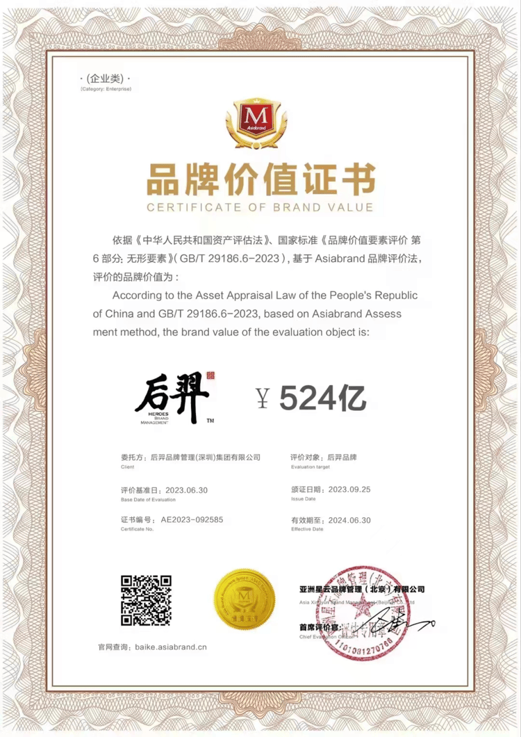 无独有偶,韩颐和匠心注册的“后羿”商标,经亚洲最具公信力的权威机构的专业评估,其价值被认定为524亿。这一令人咋舌的数字,犹如一把钥匙,开启了窥探此商标深厚文化底蕴与巨大商业潜力的大门,让人不禁对其蕴含的价值惊叹不已。
